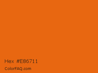 Hex #e86711 Color is a normal orange color and the nearest color is Christine #e7730a. Hex code #e86711 and RGB value is rgb(232,103,17). In RGB color space, this color is composed of 91% red, 40% green, 7% blue, In CMYK color space, this color is composed of 0% cyan, 56% magenta, 93% yellow , 9% black , In HSL color space, this color has a hue angle of 24° , 86% saturation and 49% lightness.