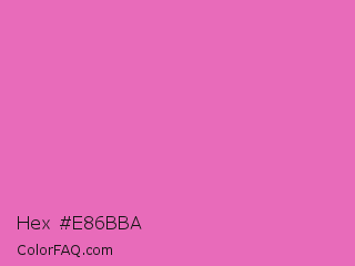 Hex #e86bba Color is a light magenta color and the nearest color is Hot Pink #ff69b4. Hex code #e86bba and RGB value is rgb(232,107,186). In RGB color space, this color is composed of 91% red, 42% green, 73% blue, In CMYK color space, this color is composed of 0% cyan, 54% magenta, 20% yellow , 9% black , In HSL color space, this color has a hue angle of 322° , 73% saturation and 66% lightness.