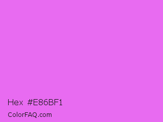 Hex #e86bf1 Color is a light magenta color and the nearest color is Heliotrope #df73ff. Hex code #e86bf1 and RGB value is rgb(232,107,241). In RGB color space, this color is composed of 91% red, 42% green, 95% blue, In CMYK color space, this color is composed of 4% cyan, 56% magenta, 0% yellow , 5% black , In HSL color space, this color has a hue angle of 296° , 83% saturation and 68% lightness.