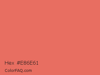 Hex #e86e61 Color is a light red color and the nearest color is Terracotta #e2725b. Hex code #e86e61 and RGB value is rgb(232,110,97). In RGB color space, this color is composed of 91% red, 43% green, 38% blue, In CMYK color space, this color is composed of 0% cyan, 53% magenta, 58% yellow , 9% black , In HSL color space, this color has a hue angle of 6° , 75% saturation and 65% lightness.