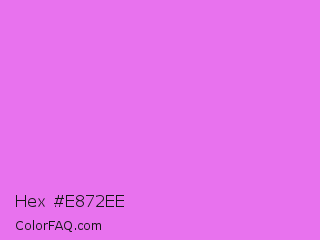 Hex #e872ee Color is a light magenta color and the nearest color is Lavender Magenta #ee82ee. Hex code #e872ee and RGB value is rgb(232,114,238). In RGB color space, this color is composed of 91% red, 45% green, 93% blue, In CMYK color space, this color is composed of 3% cyan, 52% magenta, 0% yellow , 7% black , In HSL color space, this color has a hue angle of 297° , 78% saturation and 69% lightness.