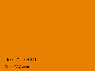 Hex #e88001 Color is a normal orange color and the nearest color is Fulvous #e48400. Hex code #e88001 and RGB value is rgb(232,128,1). In RGB color space, this color is composed of 91% red, 50% green, 0% blue, In CMYK color space, this color is composed of 0% cyan, 45% magenta, 100% yellow , 9% black , In HSL color space, this color has a hue angle of 33° , 99% saturation and 46% lightness.