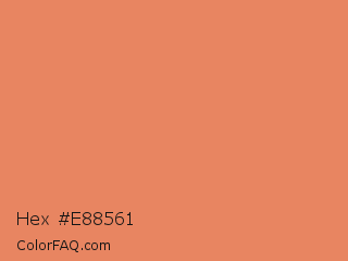 Hex #e88561 Color is a light orange color and the nearest color is Big Foot Feet #e88e5a. Hex code #e88561 and RGB value is rgb(232,133,97). In RGB color space, this color is composed of 91% red, 52% green, 38% blue, In CMYK color space, this color is composed of 0% cyan, 43% magenta, 58% yellow , 9% black , In HSL color space, this color has a hue angle of 16° , 75% saturation and 65% lightness.