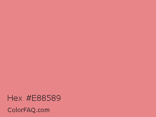 Hex #e88589 Color is a light red color and the nearest color is Light Coral #f08080. Hex code #e88589 and RGB value is rgb(232,133,137). In RGB color space, this color is composed of 91% red, 52% green, 54% blue, In CMYK color space, this color is composed of 0% cyan, 43% magenta, 41% yellow , 9% black , In HSL color space, this color has a hue angle of 358° , 68% saturation and 72% lightness.