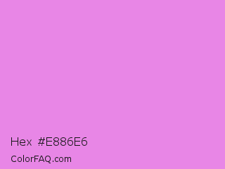 Hex #e886e6 Color is a light magenta color and the nearest color is Lavender Magenta #ee82ee. Hex code #e886e6 and RGB value is rgb(232,134,230). In RGB color space, this color is composed of 91% red, 53% green, 90% blue, In CMYK color space, this color is composed of 0% cyan, 42% magenta, 1% yellow , 9% black , In HSL color space, this color has a hue angle of 301° , 68% saturation and 72% lightness.