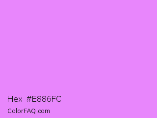 Hex #e886fc Color is a light purple color and the nearest color is Lavender Magenta #ee82ee. Hex code #e886fc and RGB value is rgb(232,134,252). In RGB color space, this color is composed of 91% red, 53% green, 99% blue, In CMYK color space, this color is composed of 8% cyan, 47% magenta, 0% yellow , 1% black , In HSL color space, this color has a hue angle of 290° , 95% saturation and 76% lightness.