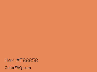 Hex #e88858 Color is a light orange color and the nearest color is Big Foot Feet #e88e5a. Hex code #e88858 and RGB value is rgb(232,136,88). In RGB color space, this color is composed of 91% red, 53% green, 35% blue, In CMYK color space, this color is composed of 0% cyan, 41% magenta, 62% yellow , 9% black , In HSL color space, this color has a hue angle of 20° , 76% saturation and 63% lightness.