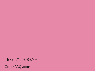 Hex #e888a8 Color is a light rose color and the nearest color is Carissma #ea88a8. Hex code #e888a8 and RGB value is rgb(232,136,168). In RGB color space, this color is composed of 91% red, 53% green, 66% blue, In CMYK color space, this color is composed of 0% cyan, 41% magenta, 28% yellow , 9% black , In HSL color space, this color has a hue angle of 340° , 68% saturation and 72% lightness.