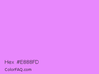 Hex #e888fd Color is a light purple color and the nearest color is Lavender Magenta #ee82ee. Hex code #e888fd and RGB value is rgb(232,136,253). In RGB color space, this color is composed of 91% red, 53% green, 99% blue, In CMYK color space, this color is composed of 8% cyan, 46% magenta, 0% yellow , 1% black , In HSL color space, this color has a hue angle of 289° , 97% saturation and 76% lightness.