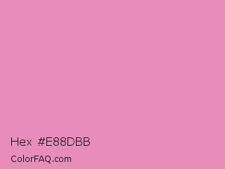 Hex #e88dbb Color is a light rose color and the nearest color is Shocking #e292c0. Hex code #e88dbb and RGB value is rgb(232,141,187). In RGB color space, this color is composed of 91% red, 55% green, 73% blue, In CMYK color space, this color is composed of 0% cyan, 39% magenta, 19% yellow , 9% black , In HSL color space, this color has a hue angle of 330° , 66% saturation and 73% lightness.