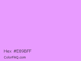 Hex #e89bff Color is a light purple color and the nearest color is Rich Brilliant Lavender #f1a7fe. Hex code #e89bff and RGB value is rgb(232,155,255). In RGB color space, this color is composed of 91% red, 61% green, 100% blue, In CMYK color space, this color is composed of 9% cyan, 39% magenta, 0% yellow , 0% black , In HSL color space, this color has a hue angle of 286° , 100% saturation and 80% lightness.