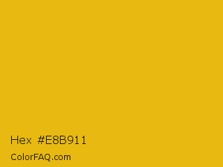 Hex #e8b911 Color is a normal yellow color and the nearest color is Gold Tips #deba13. Hex code #e8b911 and RGB value is rgb(232,185,17). In RGB color space, this color is composed of 91% red, 73% green, 7% blue, In CMYK color space, this color is composed of 0% cyan, 20% magenta, 93% yellow , 9% black , In HSL color space, this color has a hue angle of 47° , 86% saturation and 49% lightness.
