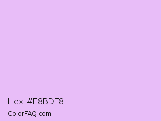 Hex #e8bdf8 Color is a very light purple color and the nearest color is Electric Lavender #f4bbff. Hex code #e8bdf8 and RGB value is rgb(232,189,248). In RGB color space, this color is composed of 91% red, 74% green, 97% blue, In CMYK color space, this color is composed of 6% cyan, 24% magenta, 0% yellow , 3% black , In HSL color space, this color has a hue angle of 284° , 81% saturation and 86% lightness.