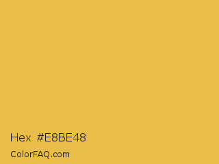 Hex #e8be48 Color is a normal orange color and the nearest color is Ronchi #ecc54e. Hex code #e8be48 and RGB value is rgb(232,190,72). In RGB color space, this color is composed of 91% red, 75% green, 28% blue, In CMYK color space, this color is composed of 0% cyan, 18% magenta, 69% yellow , 9% black , In HSL color space, this color has a hue angle of 44° , 78% saturation and 60% lightness.
