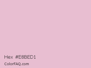 Hex #e8bed1 Color is a very light rose color and the nearest color is Melanie #e4c2d5. Hex code #e8bed1 and RGB value is rgb(232,190,209). In RGB color space, this color is composed of 91% red, 75% green, 82% blue, In CMYK color space, this color is composed of 0% cyan, 18% magenta, 10% yellow , 9% black , In HSL color space, this color has a hue angle of 333° , 48% saturation and 83% lightness.
