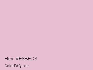 Hex #e8bed3 Color is a very light rose color and the nearest color is Melanie #e4c2d5. Hex code #e8bed3 and RGB value is rgb(232,190,211). In RGB color space, this color is composed of 91% red, 75% green, 83% blue, In CMYK color space, this color is composed of 0% cyan, 18% magenta, 9% yellow , 9% black , In HSL color space, this color has a hue angle of 330° , 48% saturation and 83% lightness.