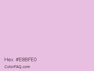 Hex #e8bfe0 Color is a very light magenta color and the nearest color is Melanie #e4c2d5. Hex code #e8bfe0 and RGB value is rgb(232,191,224). In RGB color space, this color is composed of 91% red, 75% green, 88% blue, In CMYK color space, this color is composed of 0% cyan, 18% magenta, 3% yellow , 9% black , In HSL color space, this color has a hue angle of 312° , 47% saturation and 83% lightness.