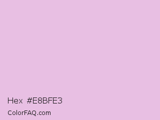 Hex #e8bfe3 Color is a very light magenta color and the nearest color is French Lilac #ecc7ee. Hex code #e8bfe3 and RGB value is rgb(232,191,227). In RGB color space, this color is composed of 91% red, 75% green, 89% blue, In CMYK color space, this color is composed of 0% cyan, 18% magenta, 2% yellow , 9% black , In HSL color space, this color has a hue angle of 307° , 47% saturation and 83% lightness.