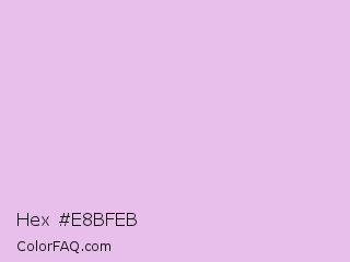 Hex #e8bfeb Color is a very light magenta color and the nearest color is French Lilac #ecc7ee. Hex code #e8bfeb and RGB value is rgb(232,191,235). In RGB color space, this color is composed of 91% red, 75% green, 92% blue, In CMYK color space, this color is composed of 1% cyan, 19% magenta, 0% yellow , 8% black , In HSL color space, this color has a hue angle of 296° , 52% saturation and 84% lightness.
