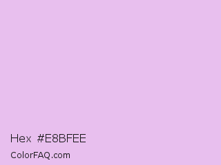 Hex #e8bfee Color is a very light magenta color and the nearest color is French Lilac #ecc7ee. Hex code #e8bfee and RGB value is rgb(232,191,238). In RGB color space, this color is composed of 91% red, 75% green, 93% blue, In CMYK color space, this color is composed of 3% cyan, 20% magenta, 0% yellow , 7% black , In HSL color space, this color has a hue angle of 292° , 58% saturation and 84% lightness.