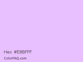 Hex #e8bfff Color is a very light purple color and the nearest color is Electric Lavender #f4bbff. Hex code #e8bfff and RGB value is rgb(232,191,255). In RGB color space, this color is composed of 91% red, 75% green, 100% blue, In CMYK color space, this color is composed of 9% cyan, 25% magenta, 0% yellow , 0% black , In HSL color space, this color has a hue angle of 278° , 100% saturation and 87% lightness.