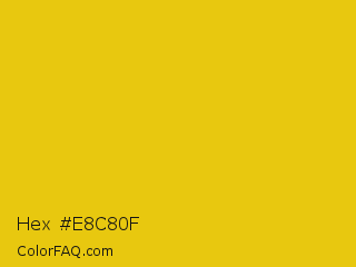Hex #e8c80f Color is a normal yellow color and the nearest color is Citrine #e4d00a. Hex code #e8c80f and RGB value is rgb(232,200,15). In RGB color space, this color is composed of 91% red, 78% green, 6% blue, In CMYK color space, this color is composed of 0% cyan, 14% magenta, 94% yellow , 9% black , In HSL color space, this color has a hue angle of 51° , 88% saturation and 48% lightness.