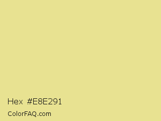 Hex #e8e291 Color is a light yellow color and the nearest color is Wild Rice #ece090. Hex code #e8e291 and RGB value is rgb(232,226,145). In RGB color space, this color is composed of 91% red, 89% green, 57% blue, In CMYK color space, this color is composed of 0% cyan, 3% magenta, 38% yellow , 9% black , In HSL color space, this color has a hue angle of 56° , 65% saturation and 74% lightness.