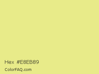 Hex #e8eb89 Color is a light yellow color and the nearest color is Key Lime #e8f48c. Hex code #e8eb89 and RGB value is rgb(232,235,137). In RGB color space, this color is composed of 91% red, 92% green, 54% blue, In CMYK color space, this color is composed of 1% cyan, 0% magenta, 42% yellow , 8% black , In HSL color space, this color has a hue angle of 62° , 71% saturation and 73% lightness.