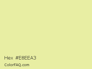 Hex #e8eea3 Color is a light yellow color and the nearest color is Pale Goldenrod #eee8aa. Hex code #e8eea3 and RGB value is rgb(232,238,163). In RGB color space, this color is composed of 91% red, 93% green, 64% blue, In CMYK color space, this color is composed of 3% cyan, 0% magenta, 32% yellow , 7% black , In HSL color space, this color has a hue angle of 65° , 69% saturation and 79% lightness.