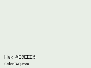 Hex #e8eee6 Color is a very light green color and the nearest color is Gray Nurse #e7ece6. Hex code #e8eee6 and RGB value is rgb(232,238,230). In RGB color space, this color is composed of 91% red, 93% green, 90% blue, In CMYK color space, this color is composed of 3% cyan, 0% magenta, 3% yellow , 7% black , In HSL color space, this color has a hue angle of 105° , 19% saturation and 92% lightness.