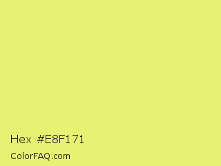 Hex #e8f171 Color is a light yellow color and the nearest color is Manz #eeef78. Hex code #e8f171 and RGB value is rgb(232,241,113). In RGB color space, this color is composed of 91% red, 95% green, 44% blue, In CMYK color space, this color is composed of 4% cyan, 0% magenta, 53% yellow , 5% black , In HSL color space, this color has a hue angle of 64° , 82% saturation and 69% lightness.
