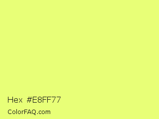 Hex #e8ff77 Color is a light yellow color and the nearest color is Honeysuckle #edfc84. Hex code #e8ff77 and RGB value is rgb(232,255,119). In RGB color space, this color is composed of 91% red, 100% green, 47% blue, In CMYK color space, this color is composed of 9% cyan, 0% magenta, 53% yellow , 0% black , In HSL color space, this color has a hue angle of 70° , 100% saturation and 73% lightness.