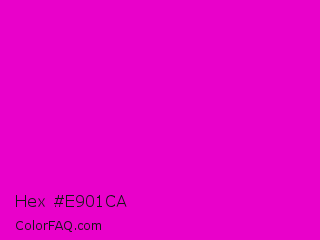 Hex #e901ca Color is a normal magenta color and the nearest color is Purple Pizzazz #ff00cc. Hex code #e901ca and RGB value is rgb(233,1,202). In RGB color space, this color is composed of 91% red, 0% green, 79% blue, In CMYK color space, this color is composed of 0% cyan, 100% magenta, 13% yellow , 9% black , In HSL color space, this color has a hue angle of 308° , 99% saturation and 46% lightness.