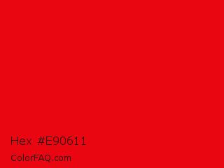 Hex #e90611 Color is a normal red color and the nearest color is KU Crimson #e8000d. Hex code #e90611 and RGB value is rgb(233,6,17). In RGB color space, this color is composed of 91% red, 2% green, 7% blue, In CMYK color space, this color is composed of 0% cyan, 97% magenta, 93% yellow , 9% black , In HSL color space, this color has a hue angle of 357° , 95% saturation and 47% lightness.