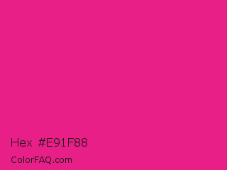 Hex #e91f88 Color is a normal rose color and the nearest color is Barbie Pink #e0218a. Hex code #e91f88 and RGB value is rgb(233,31,136). In RGB color space, this color is composed of 91% red, 12% green, 53% blue, In CMYK color space, this color is composed of 0% cyan, 87% magenta, 42% yellow , 9% black , In HSL color space, this color has a hue angle of 329° , 82% saturation and 52% lightness.