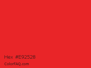 Hex #e92528 Color is a normal red color and the nearest color is Lust #e62020. Hex code #e92528 and RGB value is rgb(233,37,40). In RGB color space, this color is composed of 91% red, 15% green, 16% blue, In CMYK color space, this color is composed of 0% cyan, 84% magenta, 83% yellow , 9% black , In HSL color space, this color has a hue angle of 359° , 82% saturation and 53% lightness.