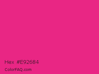 Hex #e92684 Color is a normal rose color and the nearest color is Barbie Pink #e0218a. Hex code #e92684 and RGB value is rgb(233,38,132). In RGB color space, this color is composed of 91% red, 15% green, 52% blue, In CMYK color space, this color is composed of 0% cyan, 84% magenta, 43% yellow , 9% black , In HSL color space, this color has a hue angle of 331° , 82% saturation and 53% lightness.