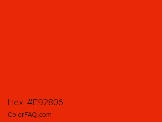 Hex #e92806 Color is a normal red color and the nearest color is Ferrari Red #ff2800. Hex code #e92806 and RGB value is rgb(233,40,6). In RGB color space, this color is composed of 91% red, 16% green, 2% blue, In CMYK color space, this color is composed of 0% cyan, 83% magenta, 97% yellow , 9% black , In HSL color space, this color has a hue angle of 9° , 95% saturation and 47% lightness.