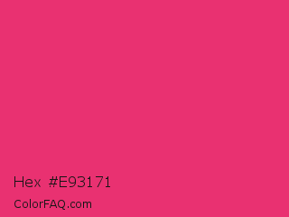 Hex #e93171 Color is a normal rose color and the nearest color is Razzmatazz #e3256b. Hex code #e93171 and RGB value is rgb(233,49,113). In RGB color space, this color is composed of 91% red, 19% green, 44% blue, In CMYK color space, this color is composed of 0% cyan, 79% magenta, 52% yellow , 9% black , In HSL color space, this color has a hue angle of 339° , 81% saturation and 55% lightness.