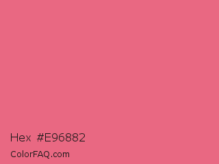 Hex #e96882 Color is a light red color and the nearest color is Candy Pink #e4717a. Hex code #e96882 and RGB value is rgb(233,104,130). In RGB color space, this color is composed of 91% red, 41% green, 51% blue, In CMYK color space, this color is composed of 0% cyan, 55% magenta, 44% yellow , 9% black , In HSL color space, this color has a hue angle of 348° , 75% saturation and 66% lightness.