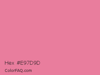 Hex #e97d9d Color is a light rose color and the nearest color is Bright Blush #e47698. Hex code #e97d9d and RGB value is rgb(233,125,157). In RGB color space, this color is composed of 91% red, 49% green, 62% blue, In CMYK color space, this color is composed of 0% cyan, 46% magenta, 33% yellow , 9% black , In HSL color space, this color has a hue angle of 342° , 71% saturation and 70% lightness.