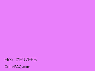 Hex #e97ffb Color is a light purple color and the nearest color is Lavender Magenta #ee82ee. Hex code #e97ffb and RGB value is rgb(233,127,251). In RGB color space, this color is composed of 91% red, 50% green, 98% blue, In CMYK color space, this color is composed of 7% cyan, 49% magenta, 0% yellow , 2% black , In HSL color space, this color has a hue angle of 291° , 94% saturation and 74% lightness.