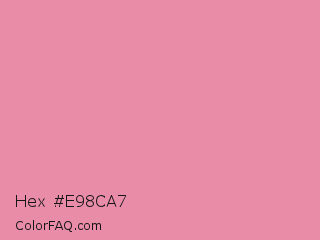 Hex #e98ca7 Color is a light rose color and the nearest color is Carissma #ea88a8. Hex code #e98ca7 and RGB value is rgb(233,140,167). In RGB color space, this color is composed of 91% red, 55% green, 65% blue, In CMYK color space, this color is composed of 0% cyan, 40% magenta, 28% yellow , 9% black , In HSL color space, this color has a hue angle of 343° , 68% saturation and 73% lightness.