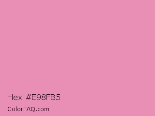 Hex #e98fb5 Color is a light rose color and the nearest color is Light Thulian Pink #e68fac. Hex code #e98fb5 and RGB value is rgb(233,143,181). In RGB color space, this color is composed of 91% red, 56% green, 71% blue, In CMYK color space, this color is composed of 0% cyan, 39% magenta, 22% yellow , 9% black , In HSL color space, this color has a hue angle of 335° , 67% saturation and 74% lightness.
