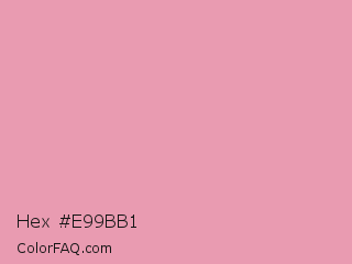Hex #e99bb1 Color is a light rose color and the nearest color is Mauvelous #ef98aa. Hex code #e99bb1 and RGB value is rgb(233,155,177). In RGB color space, this color is composed of 91% red, 61% green, 69% blue, In CMYK color space, this color is composed of 0% cyan, 33% magenta, 24% yellow , 9% black , In HSL color space, this color has a hue angle of 343° , 64% saturation and 76% lightness.