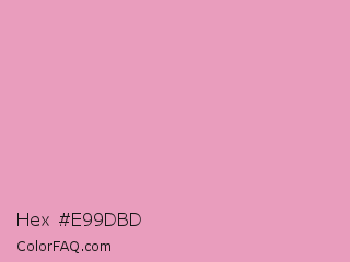 Hex #e99dbd Color is a light rose color and the nearest color is Kobi #e79fc4. Hex code #e99dbd and RGB value is rgb(233,157,189). In RGB color space, this color is composed of 91% red, 62% green, 74% blue, In CMYK color space, this color is composed of 0% cyan, 33% magenta, 19% yellow , 9% black , In HSL color space, this color has a hue angle of 335° , 63% saturation and 76% lightness.
