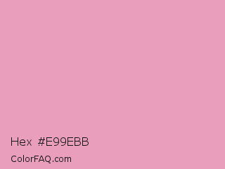 Hex #e99ebb Color is a light rose color and the nearest color is Amaranth Pink #f19cbb. Hex code #e99ebb and RGB value is rgb(233,158,187). In RGB color space, this color is composed of 91% red, 62% green, 73% blue, In CMYK color space, this color is composed of 0% cyan, 32% magenta, 20% yellow , 9% black , In HSL color space, this color has a hue angle of 337° , 63% saturation and 77% lightness.