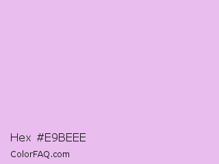 Hex #e9beee Color is a very light magenta color and the nearest color is French Lilac #ecc7ee. Hex code #e9beee and RGB value is rgb(233,190,238). In RGB color space, this color is composed of 91% red, 75% green, 93% blue, In CMYK color space, this color is composed of 2% cyan, 20% magenta, 0% yellow , 7% black , In HSL color space, this color has a hue angle of 294° , 59% saturation and 84% lightness.