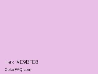 Hex #e9bfe8 Color is a very light magenta color and the nearest color is French Lilac #ecc7ee. Hex code #e9bfe8 and RGB value is rgb(233,191,232). In RGB color space, this color is composed of 91% red, 75% green, 91% blue, In CMYK color space, this color is composed of 0% cyan, 18% magenta, 0% yellow , 9% black , In HSL color space, this color has a hue angle of 301° , 49% saturation and 83% lightness.