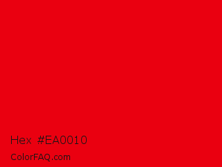 Hex #ea0010 Color is a normal red color and the nearest color is KU Crimson #e8000d. Hex code #ea0010 and RGB value is rgb(234,0,16). In RGB color space, this color is composed of 92% red, 0% green, 6% blue, In CMYK color space, this color is composed of 0% cyan, 100% magenta, 93% yellow , 8% black , In HSL color space, this color has a hue angle of 356° , 100% saturation and 46% lightness.